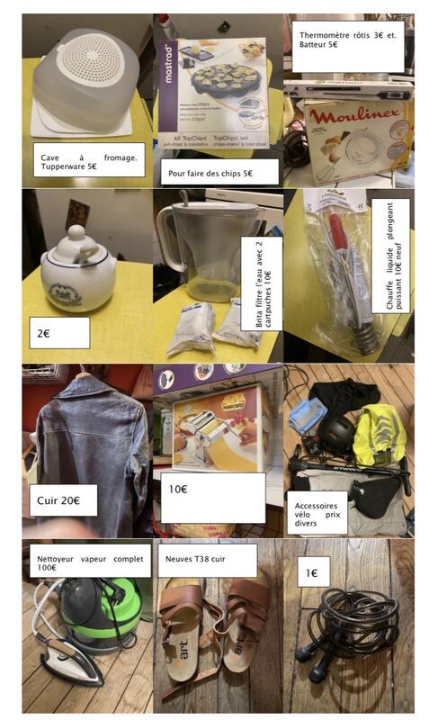 J'organise un vide maison dimanche 11 janvier paris 13e métro maison blanche si vous êtes intéressés n'hésitez à me contacter. Le vide maison c’est dimanche 11 voici quelques articles mais il y a beaucoup de choses à petit prix apporter l’appoint pour vos achat (pièces car beaucoup de petits prix) voir photos pour exemples des livres des accessoires de cuisine vaisselle (duralex, assiettes verres tasses bols) casseroles tiroirs en plastique une petite tv 20€ support tv en bois pivotant 5€ 2 bougeoirs en céramique 2€ boites/coffres en bois 2€ paniers en osier rangement 1€ bibelots 0,50€ lit de coin bois merisier complet sommier matelas neufs 450€ table papillon 19e 50€ commodes 10€ bois blanc ikea pot de fleur terre 2 radiateurs classique en tôle 5€ pièce baignoire bébé plastique bleu 5€ poubelle plastique 1€ quelques chaussures et vêtements taille 38 laissez un message pour dire à quelle heure vous souhaitez venir ( sur rdv car l’appartement est petit) merci isabelle