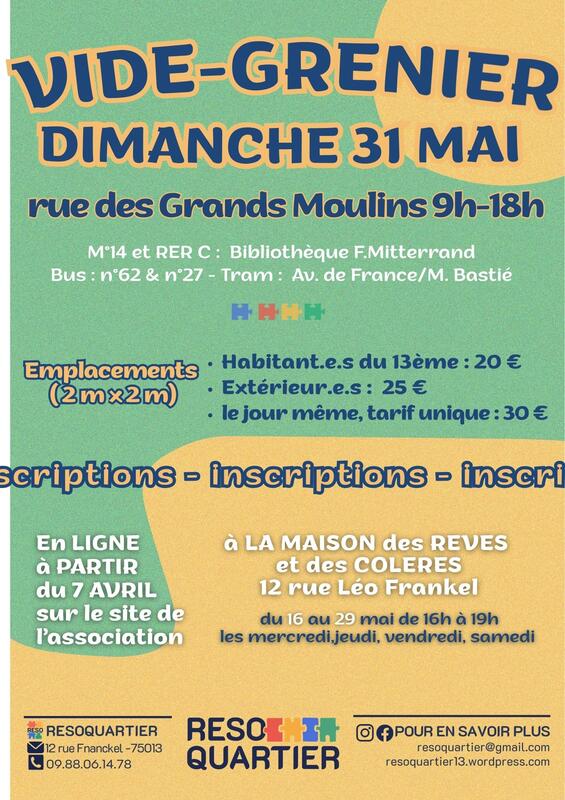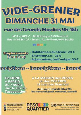 Le vide grenier de resoquartier a lieu de 9h à 18h tout au long de la rue des grands-moulins. Il est piétonnier, fermé à la circulation.