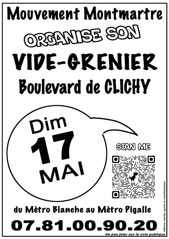 Téléchargez coupon d'inscription et renvoyer par courrier avec les documents en photocopies. Ou faire un courrier avec nom, prénom, adresse, téléphone, métrages et manifestation concernée suivit de ( je certifie avoir réalisé seulement 2 vides greniers sur l'année 2026). Documents en photocopie - pièce d'identité - règlement par chèque à l'ordre de '"asso mouvement montmartre" - tarif : 20€ résident, 23€ non rés le mètres (minimum 2m) et 2m de profondeur maximum a l'adresse : C.G.M.P boite postal 20729, paris 75827, cedex 17 report de la manifestation, tempête, mauvais temps, pluie ou problèmes divers ne donnent droit à aucun remboursement du montant de la participation. Vous recevrez par sms votre numéro d'emplacement 24h avant le vide grenier. - auncun matériel n'est fourni, prévoir vos tables. - pas de déballage au sol -respectez ces dimensions, ou nous serons dans l'obligation de vous faire reculer. - ne pas utiliser en support les abribus, boîtes aux lettres et arbres