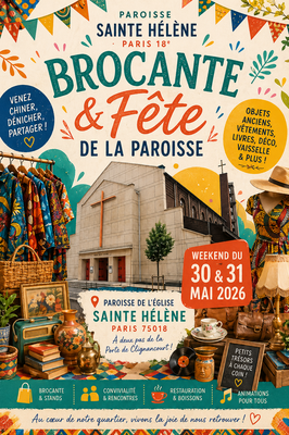 Brocante d'objets, petits meubles, vêtements, livres, jouets, bijoux... Notre vente solidaire est organisée grâce aux dons que nous recueillons toute l'année et au profit des actions sociales de la paroisse sainte hélène dans le 18ème arrondissement.