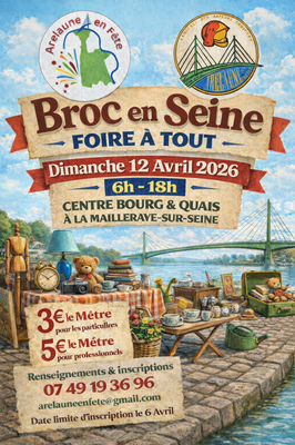 Broc en seine 2026 – la foire à tout à ne pas manquer ! Rendez-vous le dimanche 12 avril 2026 à la mailleraye-sur-seine ! Dans les rues : de la république, pasteur, jules verne, place A.Briand et sur les quais hilaire tertre et paul girardeau. Venez chiner, vendre, dénicher des trésors cachés et faire de bonnes affaires dans une ambiance conviviale et festive objets d’occasion, déco, vêtements, jouets, créations artisanales… il y en aura pour tous les goûts ! Invitez vos amis, votre famille et venez passer une belle journée au cœur de notre commune ! Restauration sur place animations pour les enfants ambiance chaleureuse garantie ! #brocenseine #arelauneenfete #lamaillerayesurseine #foireatout