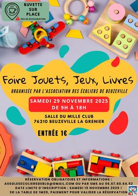 Grande foire aux jouets & aux livres . Organisée par l’association des écoliers de beuzeville-la-grenier. Venez nombreux à notre foire aux jouets et aux livres qui se tiendra le samedi 29 novembre 2025 à la salle du mille club – beuzeville-la-grenier de 9h à 18h une belle occasion de faire de bonnes affaires avant les fêtes ! Des centaines de jouets, jeux, livres pour petits et grands vous attendent à petits prix. Ambiance conviviale et buvette sur place. L’intégralité des bénéfices sera reversée au profit des projets scolaires des enfants de la commune. Partagez l’info, invitez vos amis, et venez nombreux. Nous comptons sur votre présence pour soutenir les écoliers de beuzeville-la-grenier !