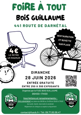 Foire à tout organisée par le club de football de bois guillaume. Nous acceuillons entre 250 et 300 exposants chaque année pour un total d'environ 1800 / 2200 mètres.
