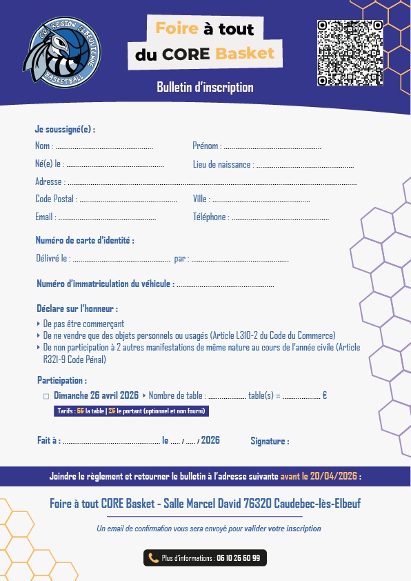 6€ la table | 2€ le portant (optionnel et non fourni)