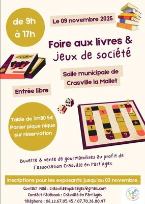 L'association crasville en part'ages organise sa toute première édition de la foire aux livres et aux jeux de société.
