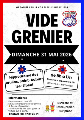 5ème vide grenier du cor elbeuf rugby ouverture pour les visiteurs à 8h, buvette et restauration sur place. Parking disponible au terrain de tennis où aux abords de l'hippodrome.
