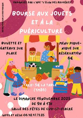 Venez participer à notre bourse aux jouets et à la puériculture, pour l'association des parents d'élèves. Les bénéfices seront pour le regroupement scolaire de cuy saint fiacre, brémontier merval et elbeuf en bray !