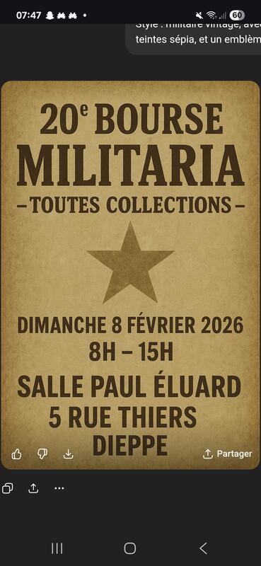 Bonjour, la 89 ème dius, association dieppoise de sauvegarde de véhicules et objets militaire organise sa 20 ème bourse militaria a la salle paul eluard de dieppe le dimanche 8 fevrier. L'événement aura lieu de 8h a 15h. L'entrée est au tarif de 2€ et gratuite pour les moins de 16 ans. La 30 aîne d'exposants reparti sur plus de 110 m linéaire de stand, vous proposent tout objet et uniforme sur la première et deuxième guerre mondiale ainsi que quelques objets de l'empire.