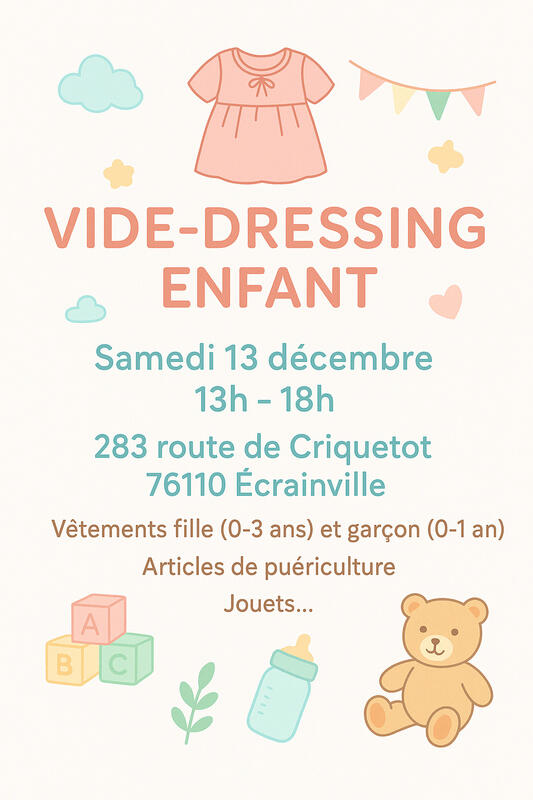 Bonjour, je fais un vide dressing enfant a mon domicile. J’ai des vetements de fille de 0 à 3 ans et des vetements de garçon de 0 à 1 an. En plus j’ai des articles de puériculture et quelques jouets