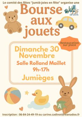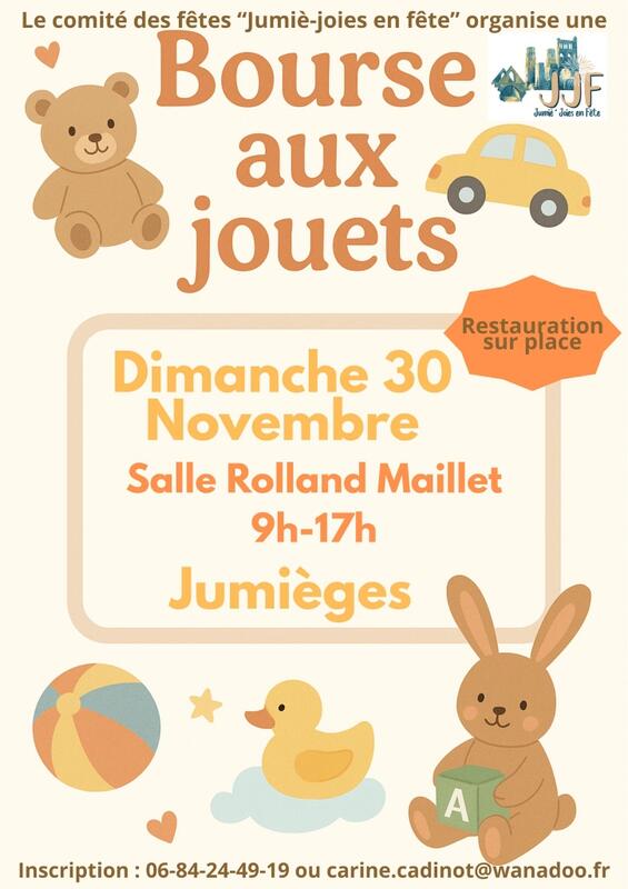 Le comité des fêtes jumiè'joies en fête organise une bourse aux jouets le dimanche 30 novembre 2025 de 9h à 17h.