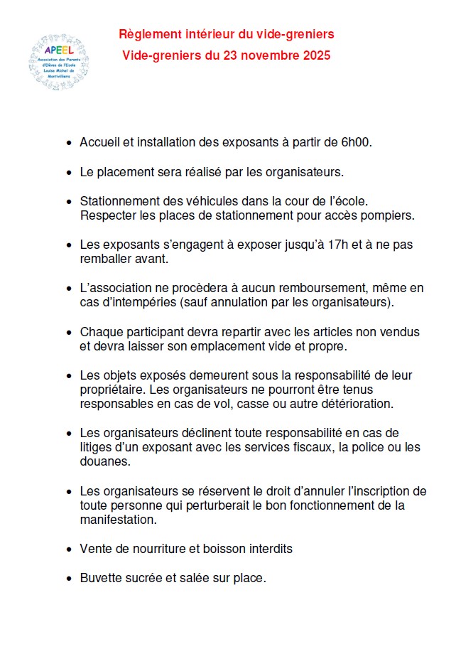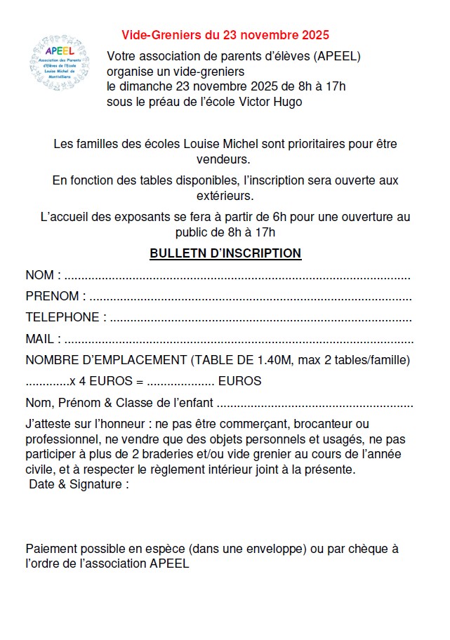 L'association des parents d'élèves de l'école louise michel de montivilliers organise un vide-greniers dans le préau de l'école victor hugo à montivilliers. Entrée gratuite. Buvette sur place.