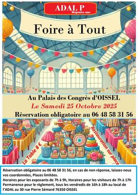 Nous organisons une « foire à tout » le samedi 25 octobre 2025 au palais des congrès d’oissel.
