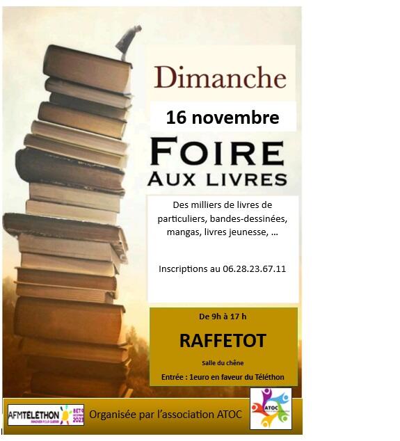 3eme foire aux livres de raffetot ; des particuliers vendent leurs livres ; des milliers de livres, bandes-dessinées, mangas, revues, de nombreux livres jeunesse à petits prix chaque année.. Entrée 1 euro au profit du téléthon.