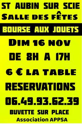 L'association appsa organise sa bourse aux jouets le 16 novembre 2025 à la salle des fêtes de saint aubin sur scie. Restauration sur place.