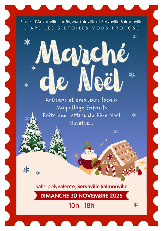 l’ambiance chaleureuse et festive de noël s’invite à servaville-salmonville ! Venez partager un moment magique en famille ou entre amis lors de notre marché de noël, organisé par l’ape « les 3 étoiles ».