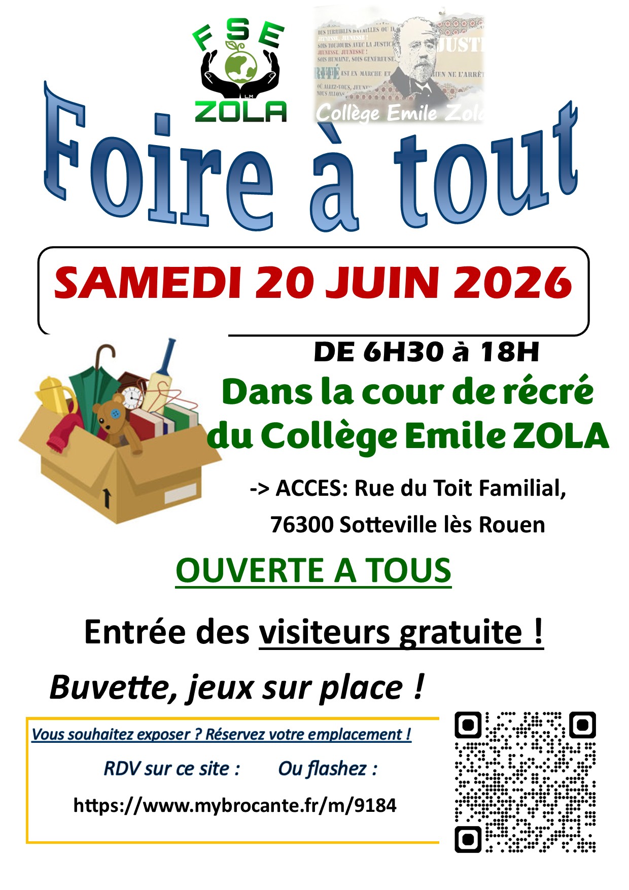 Que faire en juin 2026 ? Venez exposer ou simplement vous balader et même faire quelques affaires lors de notre foire a tout qui aura lieu le samedi 20 juin 2026 dans la cour de récréation du college emile zola de sotteville-lès-rouen !