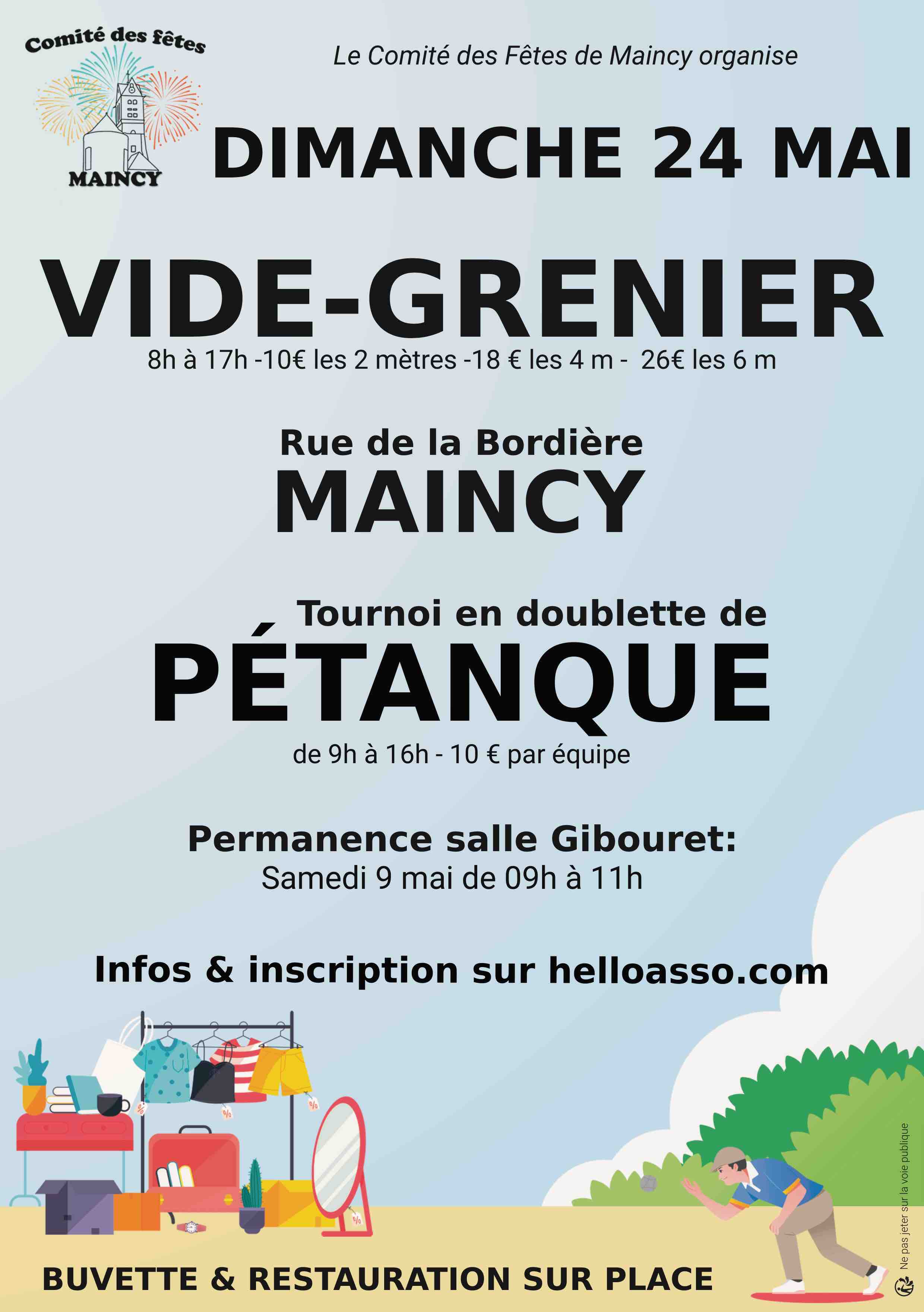 Fort du succès de l’an dernier, le vide-grenier de maincy vous accueille au cœur du village, rue de la bordière. Fête foraine tout le week-end. Une buvette avec restauration sera également disponible sur place.
