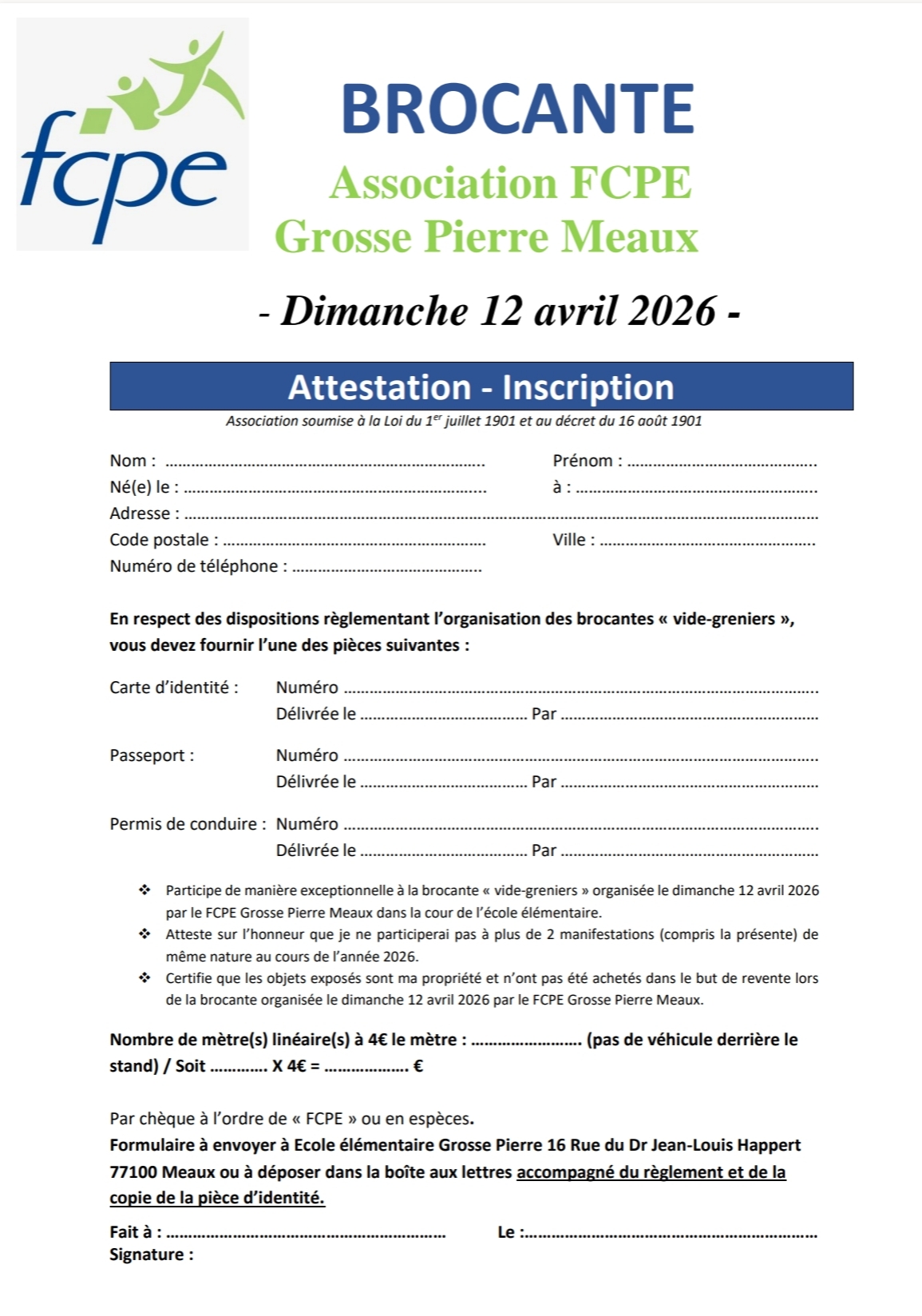 Le fcpe grosse pierre est heureux de vous faire savoir de l'organisation de sa brocante au sein de la grande cour de l'école élémentaire de la grosse pierre à meaux, le dimanche 12 avril 2026 de 9h00 à 16h00 pour les visiteurs.