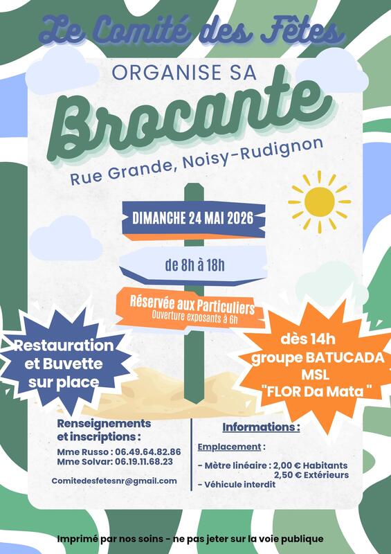 le comité des fêtes organise une grande brocante le dimanche 24 mai dans les rues de noisy-rudignon.