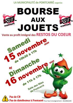 17ème édition : bourse aux jouets les samedi 15 novembre 2025 de 10h30 à 17h et dimanche 16 novembre 2025 de 11h à 17h à la salle des fêtes de pontcarré (77135) au 81bis grande rue.