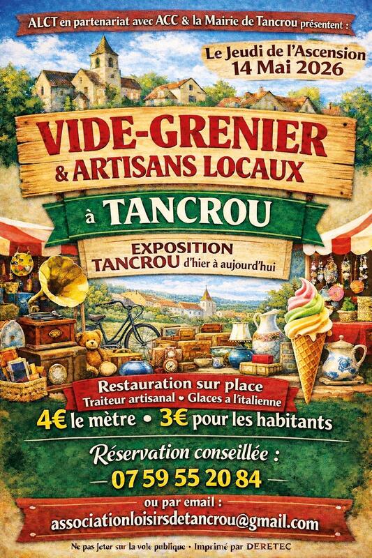 Vous souhaitez faire du tri, donner une seconde vie à vos objets… ou simplement vivre une journée conviviale et animée ? Le traditionnel vide-greniers de tancrou et marché artisanal (seine et marne) vous ouvrent leurs portes ! Réservez dès maintenant votre emplacement et profitez d’un événement apprécié, où chineurs et visiteurs se retrouvent chaque année dans une ambiance chaleureuse. C’est l’occasion idéale de vendre facilement, de rencontrer du monde et de participer à la vie locale. Les visiteurs seront au rendez-vous pour flâner entre les stands… et repartir, peut-être, avec l’objet qu’ils convoitaient depuis longtemps ! Cette année, profitez également de nombreuses animations : • produits locaux et petite restauration sur place • exposition « tancrou d’hier à aujourd’hui » • vide-greniers situé dans la partie basse du village sur place, tout est réuni pour faire de cette journée un véritable moment de découverte et de partage, dans un cadre authentique. Installation simple ambiance conviviale forte affluence attendue n’attendez pas, les places sont limitées ! Rejoignez-nous à tancrou pour une belle journée de partage et de bonnes affaires.