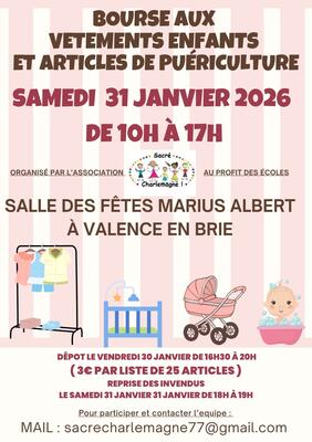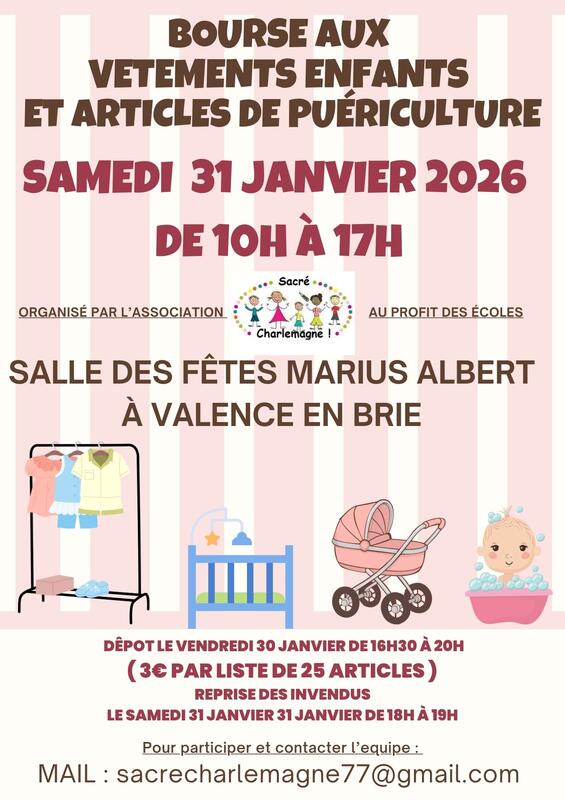 Bonjour venez chiner et trouver vos oermes rares fashion et pratique lors de notre bourse aux vêtements et puériculture une partie des ventes serviront aux projets éducatifs des écoles et a l'organisation d'autres événements pour les enfants alors n'hésitez plus nous vous attendons nombreux pour ceux qui souhaiteraient vendre envoyez nous un mail a nous vous enverrons tout les papiers