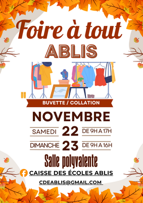 La foire à tout d’ablis revient les samedi 22 et dimanche 23 novembre 2025 exceptionnellement à la salle polyvalente !