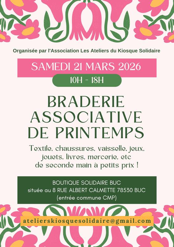 l'association les ateliers du kiosque solidaire vous propose une journée spéciale braderie de printemps avec une large sélection d’articles en promo (vêtements adultes/enfants, chaussures, livres, jouets, etc)