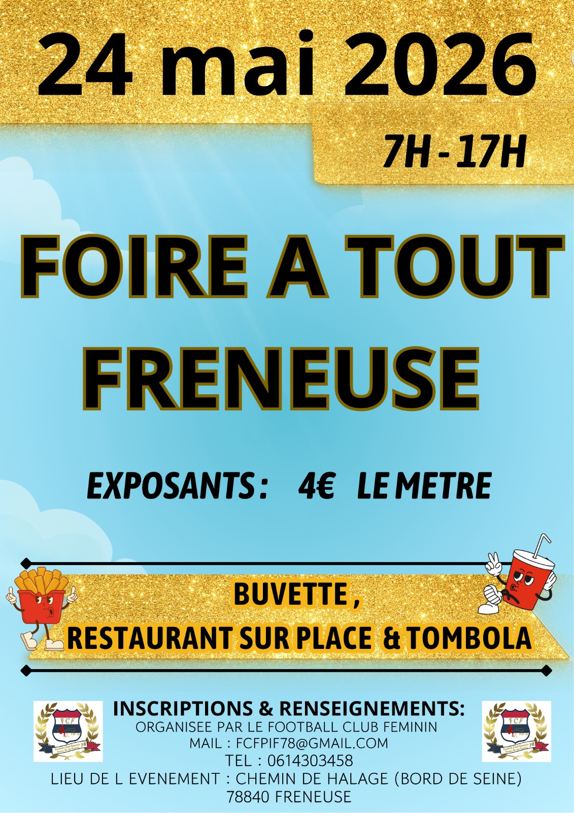 La grande foire à tout de freneuse fait son grand retour pour la 4ème édition, organisée par le football club féminin des portes île-de-france, revient pour une nouvelle édition conviviale et pleine de bonnes affaires ! Depuis sa création, 150 exposants sont au rendez-vous chaque années et repartent avec le sourire… et des voitures presque vides ! Un vrai succès qui confirme l’engouement autour de cet événement incontournable. Venez profiter d’une journée festive dans un cadre verdoyant sur la commune de freneuse, entre trouvailles, échanges et bonne humeur. Un espace de restauration sera disponible tout au long de la journée. Accès pmr. Accès wc réservez vite votre emplacement et venez nombreux nous rendre visite ! Reservation ou par mail :