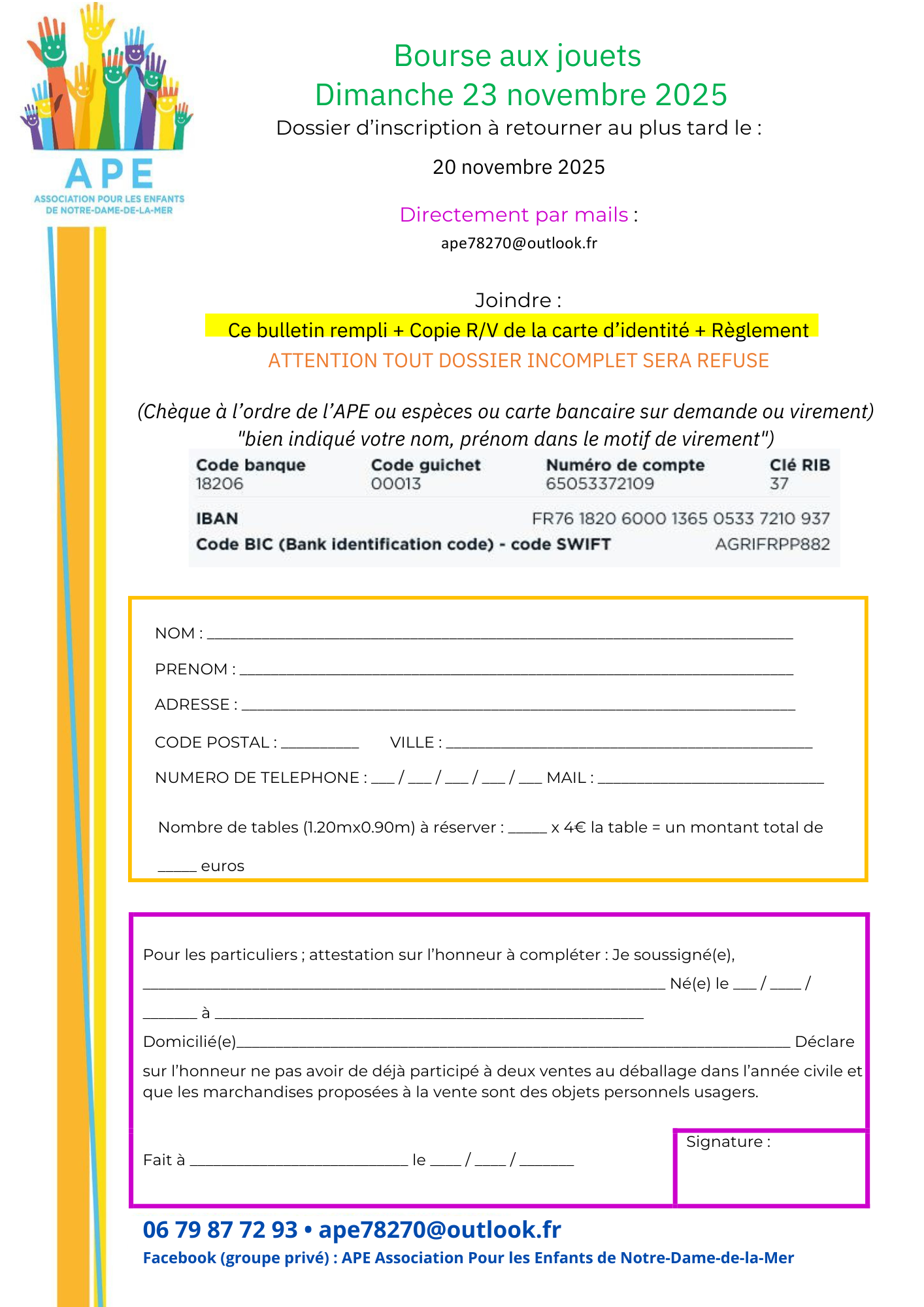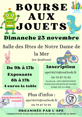 l'association ape organise une bourse aux jouets le dimanche 23 novembre 2025 dans la salle des fêtes de notre-dame-de-la-mer.