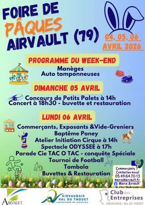 Le 6 avril prochain, c'est le retour de la grande foire du lundi de pâques à airvault !Commerçants, artisans, vente aux déballage, buvette, restauration, tombola, manèges, tournois foot/tennis de table, vide-greniers, balades en poney...