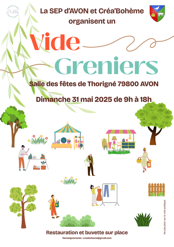 La sep d'avon et créa'bohème organisent leur 1er vide greniers à la salle des fêtes. Il y aura aussi un marché de créateurs et producteurs.