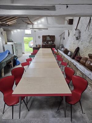 Vide maison, vide ancienne ferme. Mobilier, dont nombreuses tables et chaises en formica. Buffets. Chaises et bancs en plastique pour l'extérieur. Outillage, dont 2 échelles en alu et une débrousailleuse. Nombreux sacs en toile de jute.