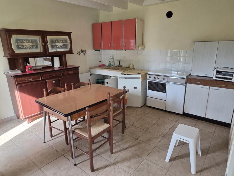 Av mobilier (nombreuses tables et chaises en formica), gazinières, réfrigérateurs, buffets, vaisselle, déco ancienne. Outillage dont 2 échelles en alu, une débrousailleuse et un pulvérisateur. Nombreux sacs en toile de jute. 2 bancs et nombreuses chaises en plastique pour l'extérieur. 2 brouettes en bois....