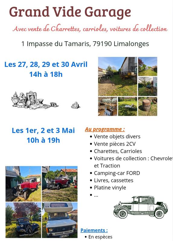 Grand vide garage avec vente de charrettes, carrioles, voitures de collection