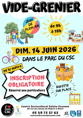 Le vide-grenier se déroulera dans le parc autour du csc sainte-pezenne (rue du coteau saint-hubert 79000 niort) dimanche 14 juin 2026 de 9h à 18h.