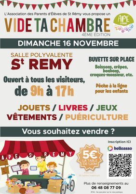 L’ape de st rémy (ecole maison de la plaine) vous propose une 4ème édition de son “vide ta chambre” le dimanche 16 novembre de 9h à 17h à la salle polyvalente de st rémy pour aider au financement des projets éducatifs de l’école.