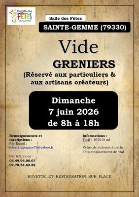 Le comité des fêtes de sainte-gemme organise son vide-greniers le dimanche 07 juin 2026. Ouvert aux particuliers ainsi qu'aux artisans créateurs.