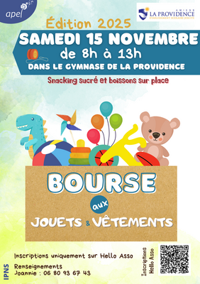 Pour la 4ème année consécutive, l'apel organise la bourse aux jouets et vêtements de la providence... Elle se déroulera le samedi 15 novembre de 8h à 13h dans le gymnase de l'établissement