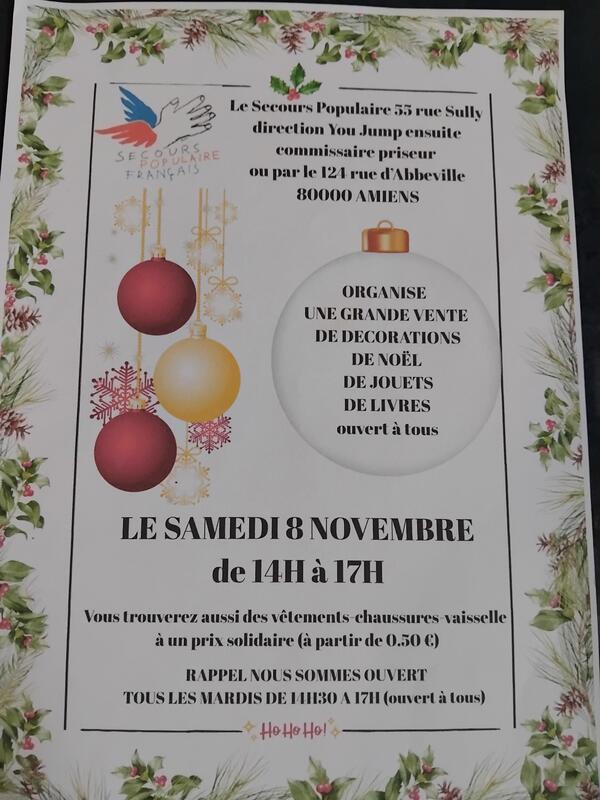 Le samedi 8 novembre de 14h à 17h le secours populaire 55 rue sully à amiens organise une grande vente de décorations de noël, de livres,de jouets,vêtements etc à prix solidaires ouvert à tous