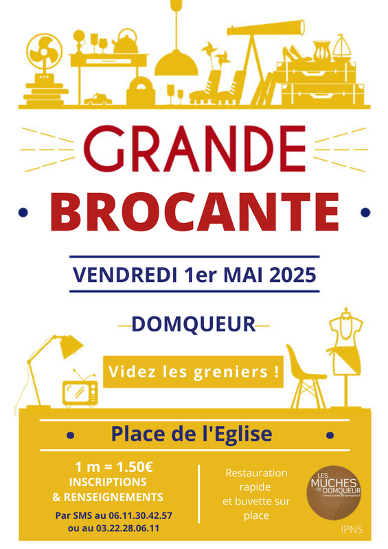 Venez chiner et faire de bonnes affaires lors de la grande brocante de domqueur qui aura lieu le vendredi 1er mai 2025 sur la place de l'église.