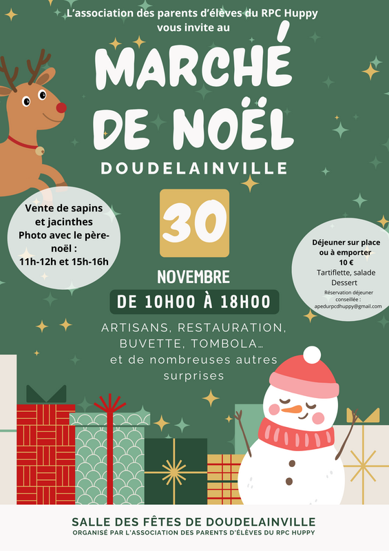 L’association des parents d’élèves du rpc huppy vous invite à une journée festive et conviviale à la salle des fêtes de doudelainville, de 10h à 18h. Au programme : artisans locaux, créations, livres, savons, vinyles, fleurs, décorations, gourmandises vente de sapins et de jacinthes photos avec le père noël (11h–12h et 15h–16h) grande tombola : lots électroménagers, places de concert, bons d’achat chez les commerçants locaux buvette, vin chaud, crêpes et autres douceurs tartiflette sur place ou à emporter – 10 € (réservation conseillée : ) venez en famille partager la magie de noël, soutenir l’école et repartir les bras chargés de surprises ! Salle des fêtes de doudelainville de 10h à 18h
