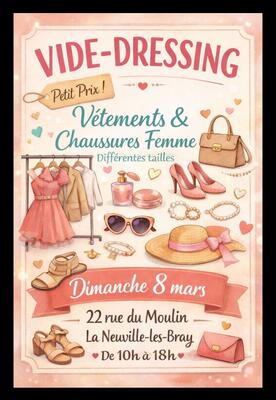 On se retrouve le dimanche 8 mars 2026 à l'occasion d'un grand vide-dressing pour femme. Toutes les tailles du 36 au 48 en bon très bon état et à petit prix.