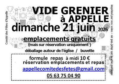Comité des fêtes d’appelle déballage autour de l’église / buvette dimanche 21 juin 2026 emplacements gratuits (mais sur réservation uniquement 10€ de caution) formule repas à midi 10 € réservation emplacements et repas