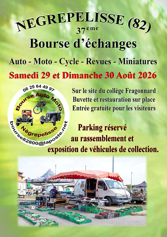 Bourse d'échanges de pièces auto, moto, de cycles, miniatures, revue techniques, plaques émaillées...Etc... Avec un grand parking réservé aux visiteurs venant en véhicules de collection afin de les exposer ou, éventuellement, de les proposer à la vente.