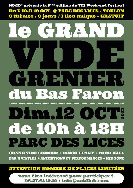 Un grand vide grenier se tiendra de 10h à 18h sur le parc des lices dimanche 12 octobre à l'occasion de la 9ème édition du festival yes week-end#9. .Venez chiner tout en appréciant les autres propositions présentes sur le lieu : foodtrucks & bars, loto à 15h , châteaux gonflables , grands jeux en bois pour petits et grands en libre accès, petite sélection de stands de créateurs locaux, dj set .... Evènement festival yes week end : https://fb.me/e/6q7DDu0da . Pour des informations complémentaires : parking gratuit à proximité, buvette & restauration sur place, entrée gratuite. Yes week-end festival est une production no/id* mail de contact : .Nos principaux réseaux sociaux : page facebook : @noidlabtoulon / page instagram : @noidlab www.yeswknd.fr