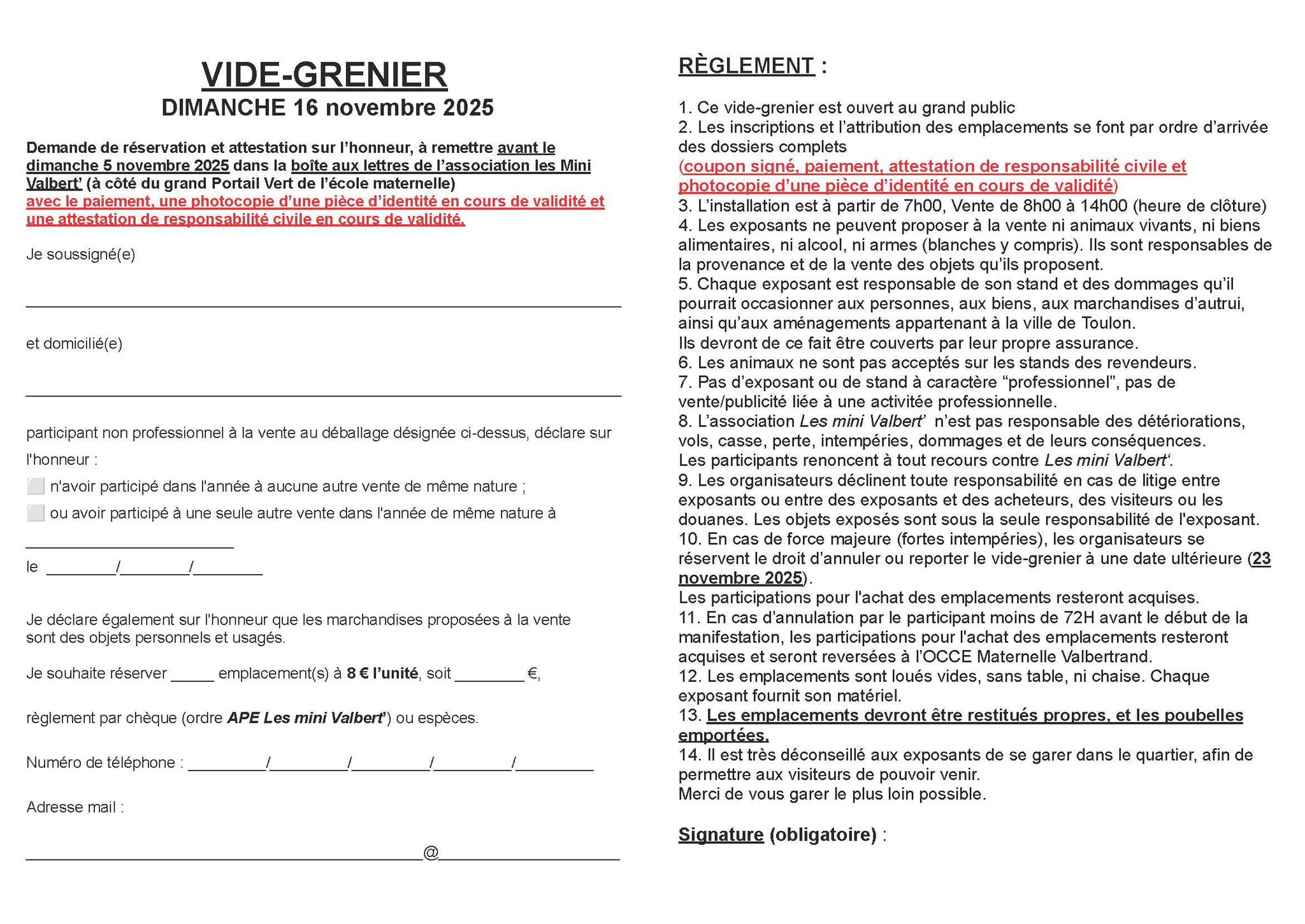 En cas d’intempéries, le vide grenier sera reporté au 23 novembre 2025, dans les mêmes conditions.