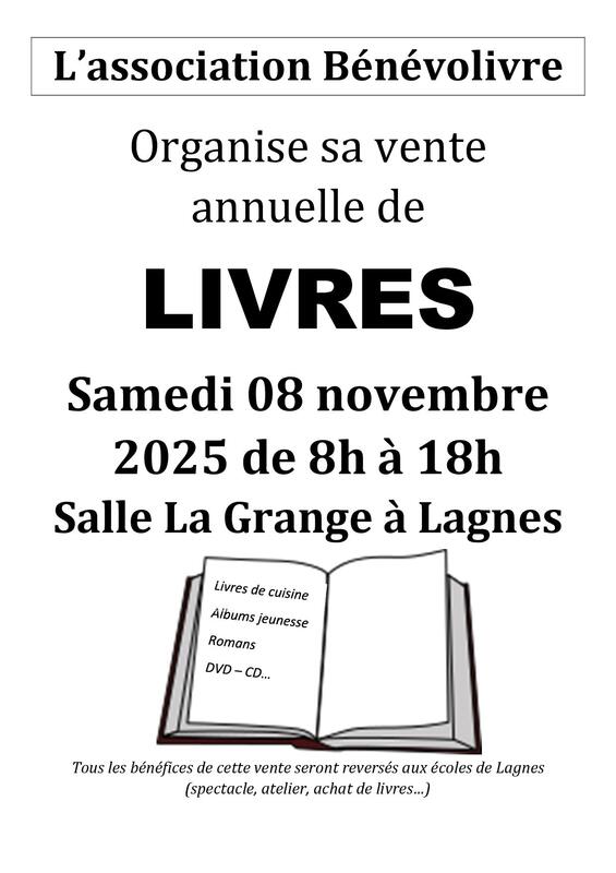 L’association bénévolivre présentera à la vente tous les livres d’occasion qu’elle a reçu en don dans la salles des fêtes.