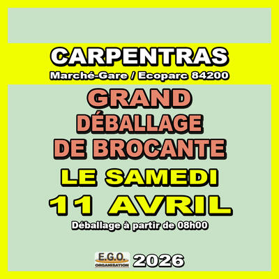 Grand déballage de brocante marché-gare / écoparc – 84200 carpentras -- le samedi 11 avril 2026 – de 08h00 à 14h00 venez chiner des trésors et découvrir une ambiance conviviale au cœur de la brocan...