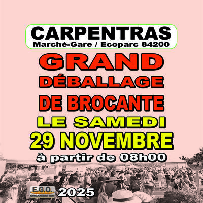 Grand déballage de brocante marché-gare / écoparc – 84200 carpentras samedi 29 novembre – de 08h00 à 16h00 venez chiner des trésors et découvrir une ambiance conviviale au cœur de la brocante ! Inf...